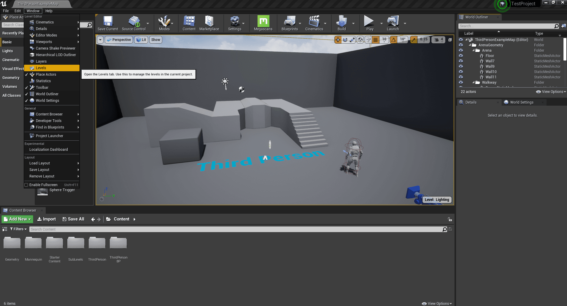 mainbranch. - Open the Unreal Editor and click on Windows > Levels. Dock the tab beside the World Outliner.